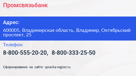 Промсвязьбанк по адресу 600005, Владимирская область, Владимир, Октябрьский проспект, 25 в дальнейшем Организация, размещена в следующих категориях: