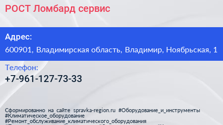 РОСТ Ломбард-сервис по адресу 600901, Владимирская область, Владимир, Ноябрьская, 1 в дальнейшем Организация, размещена в следующих категориях: