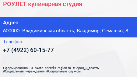 РОУЛЕТ, кулинарная студия по адресу 600000, Владимирская область, Владимир, Семашко, 8 в дальнейшем Организация, размещена в следующих категориях: