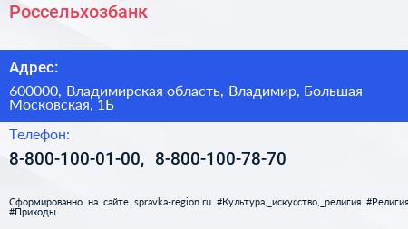 Россельхозбанк по адресу 600000, Владимирская область, Владимир, Большая Московская, 1Б в дальнейшем Организация, размещена в следующих категориях: