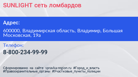 SUNLIGHT, сеть ломбардов по адресу 600000, Владимирская область, Владимир, Большая Московская, 19а в дальнейшем Организация, размещена в следующих категориях: