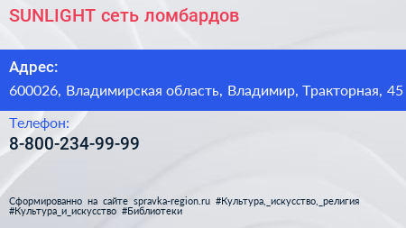 SUNLIGHT, сеть ломбардов по адресу 600026, Владимирская область, Владимир, Тракторная, 45 в дальнейшем Организация, размещена в следующих категориях: