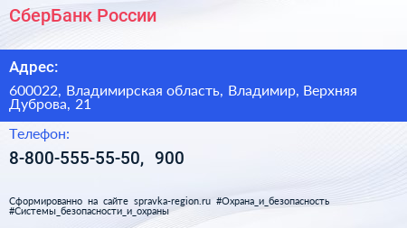 СберБанк России по адресу 600022, Владимирская область, Владимир, Верхняя Дуброва, 21 в дальнейшем Организация, размещена в следующих категориях: