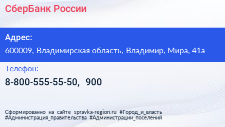 СберБанк России по адресу 600009, Владимирская область, Владимир, Мира, 41а в дальнейшем Организация, размещена в следующих категориях: