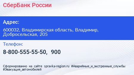 СберБанк России по адресу 600032, Владимирская область, Владимир, Добросельская, 205 в дальнейшем Организация, размещена в следующих категориях: