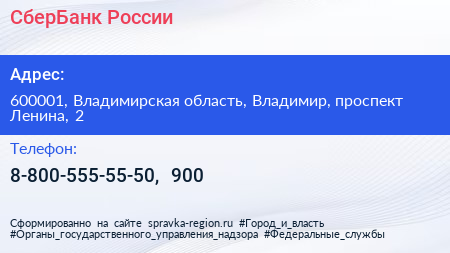 СберБанк России по адресу 600001, Владимирская область, Владимир, проспект Ленина, 2 в дальнейшем Организация, размещена в следующих категориях: