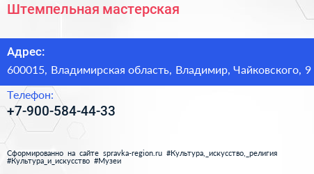 Штемпельная мастерская по адресу 600015, Владимирская область, Владимир, Чайковского, 9 в дальнейшем Организация, размещена в следующих категориях: