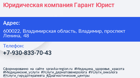 Юридическая компания Гарант Юрист по адресу 600022, Владимирская область, Владимир, проспект Ленина, 48 в дальнейшем Организация, размещена в следующих категориях:
