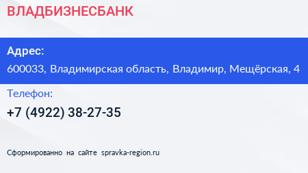 ВЛАДБИЗНЕСБАНК по адресу 600033, Владимирская область, Владимир, Мещёрская, 4 в дальнейшем Организация, размещена в следующих категориях: