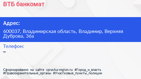 ВТБ, банкомат по адресу 600037, Владимирская область, Владимир, Верхняя Дуброва, 36а в дальнейшем Организация, размещена в следующих категориях: