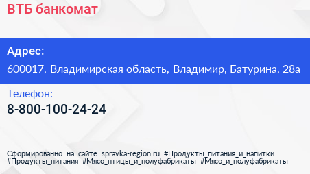 ВТБ, банкомат по адресу 600017, Владимирская область, Владимир, Батурина, 28а в дальнейшем Организация, размещена в следующих категориях: