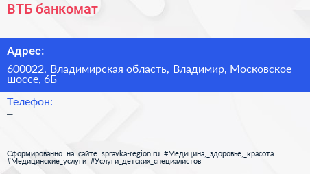 ВТБ, банкомат по адресу 600022, Владимирская область, Владимир, Московское шоссе, 6Б в дальнейшем Организация, размещена в следующих категориях: