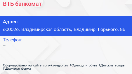 ВТБ, банкомат по адресу 600026, Владимирская область, Владимир, Горького, 86 в дальнейшем Организация, размещена в следующих категориях:
