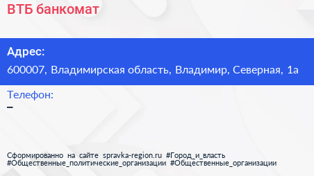 ВТБ, банкомат по адресу 600007, Владимирская область, Владимир, Северная, 1а в дальнейшем Организация, размещена в следующих категориях: