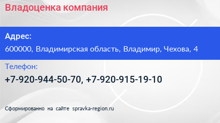 Владоценка, компания по адресу 600000, Владимирская область, Владимир, Чехова, 4 в дальнейшем Организация, размещена в следующих категориях: