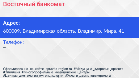 Восточный, банкомат по адресу 600009, Владимирская область, Владимир, Мира, 41 в дальнейшем Организация, размещена в следующих категориях: