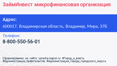 ЗаймИнвест, микрофинансовая организация по адресу 600017, Владимирская область, Владимир, Мира, 37Б в дальнейшем Организация, размещена в следующих категориях: