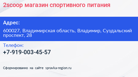 2scoop, магазин спортивного питания по адресу 600027, Владимирская область, Владимир, Суздальский проспект, 28 в дальнейшем Организация, размещена в следующих категориях: