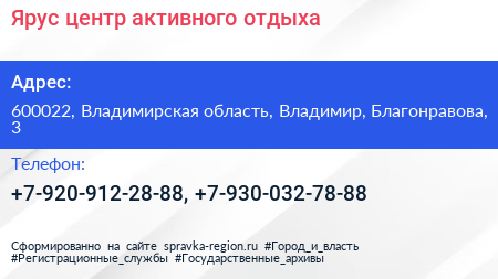 Ярус, центр активного отдыха по адресу 600022, Владимирская область, Владимир, Благонравова, 3 в дальнейшем Организация, размещена в следующих категориях: