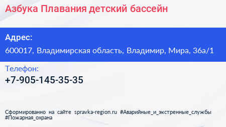 Азбука Плавания, детский бассейн по адресу 600017, Владимирская область, Владимир, Мира, 36а/1 в дальнейшем Организация, размещена в следующих категориях: