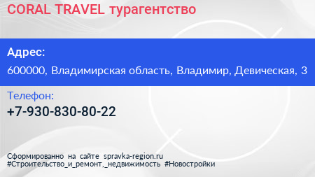CORAL TRAVEL, турагентство по адресу 600000, Владимирская область, Владимир, Девическая, 3 в дальнейшем Организация, размещена в следующих категориях:
