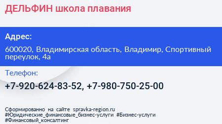 ДЕЛЬФИН, школа плавания по адресу 600020, Владимирская область, Владимир, Спортивный переулок, 4а в дальнейшем Организация, размещена в следующих категориях: