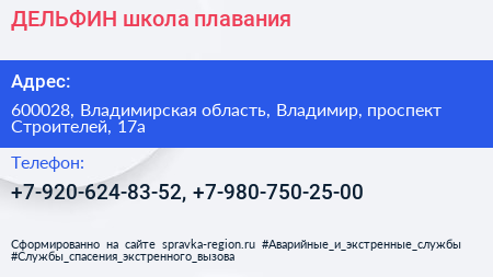 ДЕЛЬФИН, школа плавания по адресу 600028, Владимирская область, Владимир, проспект Строителей, 17а в дальнейшем Организация, размещена в следующих категориях: