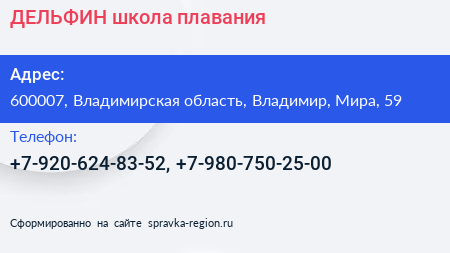 ДЕЛЬФИН, школа плавания по адресу 600007, Владимирская область, Владимир, Мира, 59 в дальнейшем Организация, размещена в следующих категориях: