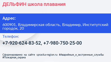 ДЕЛЬФИН, школа плавания по адресу 600901, Владимирская область, Владимир, Институтский городок, 20 в дальнейшем Организация, размещена в следующих категориях: