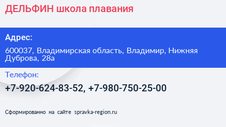 ДЕЛЬФИН, школа плавания по адресу 600037, Владимирская область, Владимир, Нижняя Дуброва, 28а в дальнейшем Организация, размещена в следующих категориях: