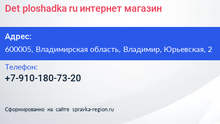 Det-ploshadka.ru, интернет-магазин по адресу 600005, Владимирская область, Владимир, Юрьевская, 2 в дальнейшем Организация, размещена в следующих категориях: