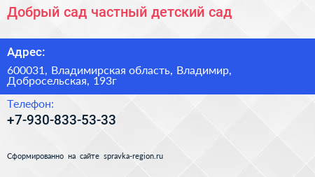 Добрый сад, частный детский сад по адресу 600031, Владимирская область, Владимир, Добросельская, 193г в дальнейшем Организация, размещена в следующих категориях: