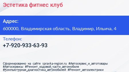 Эстетика, фитнес-клуб по адресу 600000, Владимирская область, Владимир, Ильича, 4 в дальнейшем Организация, размещена в следующих категориях: