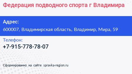 Федерация подводного спорта г. Владимира по адресу 600007, Владимирская область, Владимир, Мира, 59 в дальнейшем Организация, размещена в следующих категориях: