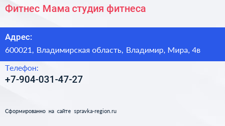 Фитнес Мама, студия фитнеса по адресу 600021, Владимирская область, Владимир, Мира, 4в в дальнейшем Организация, размещена в следующих категориях: