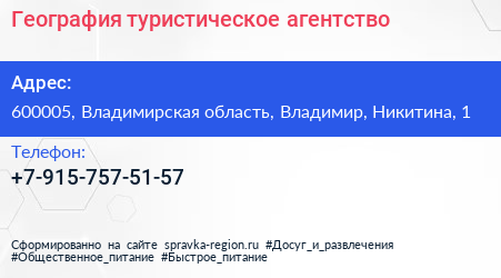 География, туристическое агентство по адресу 600005, Владимирская область, Владимир, Никитина, 1 в дальнейшем Организация, размещена в следующих категориях: