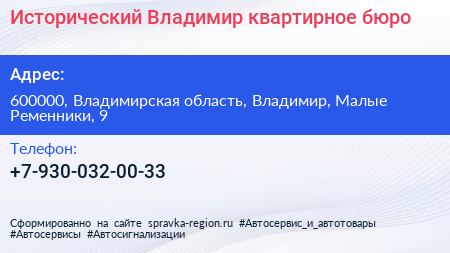 Исторический Владимир, квартирное бюро по адресу 600000, Владимирская область, Владимир, Малые Ременники, 9 в дальнейшем Организация, размещена в следующих категориях: