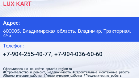 LUX KART по адресу 600005, Владимирская область, Владимир, Тракторная, 45а в дальнейшем Организация, размещена в следующих категориях: