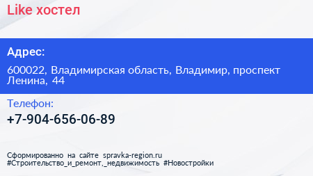Like, хостел по адресу 600022, Владимирская область, Владимир, проспект Ленина, 44 в дальнейшем Организация, размещена в следующих категориях: