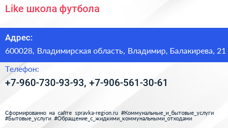 Like, школа футбола по адресу 600028, Владимирская область, Владимир, Балакирева, 21 в дальнейшем Организация, размещена в следующих категориях: