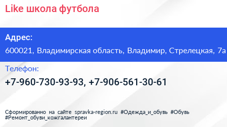 Like, школа футбола по адресу 600021, Владимирская область, Владимир, Стрелецкая, 7а в дальнейшем Организация, размещена в следующих категориях: