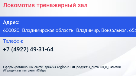Локомотив, тренажерный зал по адресу 600020, Владимирская область, Владимир, Вокзальная, 65а в дальнейшем Организация, размещена в следующих категориях: