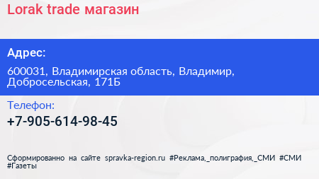 Lorak trade, магазин по адресу 600031, Владимирская область, Владимир, Добросельская, 171Б в дальнейшем Организация, размещена в следующих категориях: