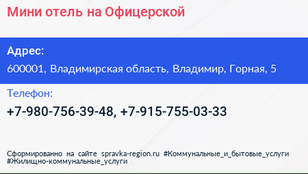 Мини-отель на Офицерской по адресу 600001, Владимирская область, Владимир, Горная, 5 в дальнейшем Организация, размещена в следующих категориях:
