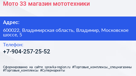 Мото 33, магазин мототехники по адресу 600022, Владимирская область, Владимир, Московское шоссе, 5 в дальнейшем Организация, размещена в следующих категориях: