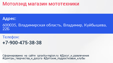 Мотолэнд, магазин мототехники по адресу 600035, Владимирская область, Владимир, Куйбышева, 22Б в дальнейшем Организация, размещена в следующих категориях:
