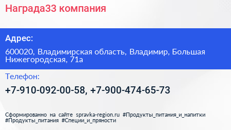 Награда33, компания по адресу 600020, Владимирская область, Владимир, Большая Нижегородская, 71а в дальнейшем Организация, размещена в следующих категориях:
