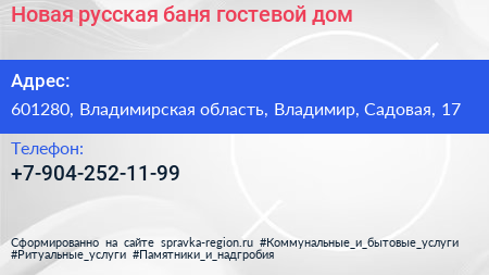 Новая русская баня, гостевой дом по адресу 601280, Владимирская область, Владимир, Садовая, 17 в дальнейшем Организация, размещена в следующих категориях: