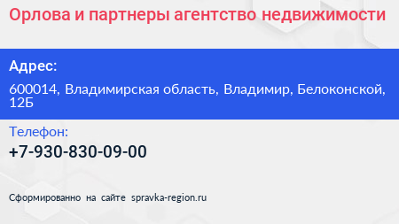 Орлова и партнеры, агентство недвижимости по адресу 600014, Владимирская область, Владимир, Белоконской, 12Б в дальнейшем Организация, размещена в следующих категориях: