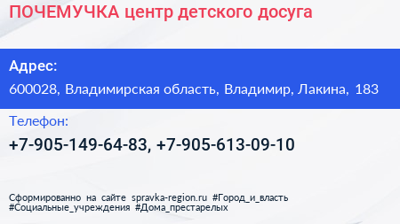 ПОЧЕМУЧКА, центр детского досуга по адресу 600028, Владимирская область, Владимир, Лакина, 183 в дальнейшем Организация, размещена в следующих категориях: